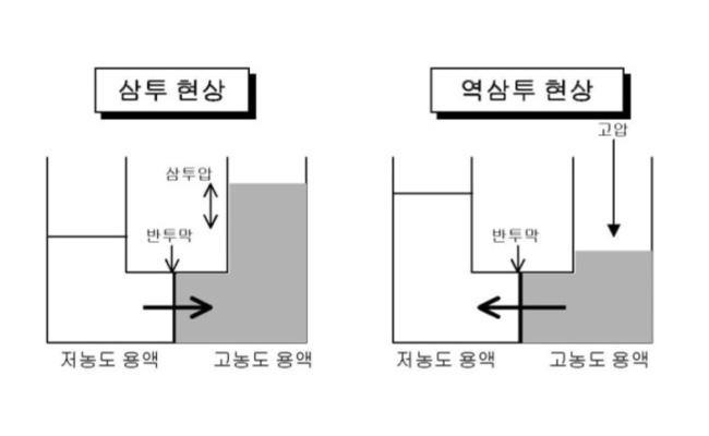 삼투압 현상을 이용하여 고농도 용액에 삼투압보다 큰 압력을 가해서 고농도 용액의 물이 반투막을 통과해 저농도 용액 쪽으로 강제 이동시켜 정제수를 얻는 법입니다. 역삼투 방식은 이온교환방식 보다 유지 관리가 간편하지만 이온교환방식 정도로 완전히 순수한 정제수를 얻기는 어렵습니다.