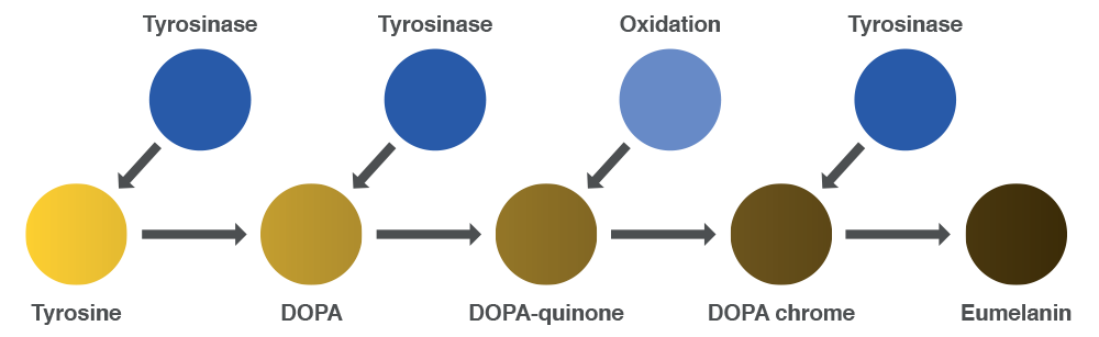 티로시나아제(Tyrosinase)의 촉매작용으로 티로신(Tyrosine)이 산화하여 도파(DOPA)로 중간체가 형성되고 이 과정을 한번 더 거쳐 2차 중간체인 도파-퀴논(DOPA-quinone)으로 변화합니다. DOPA-quinone은 자동 산화하여 3차 중간체인 도파 크롬(DOPA chrome)으로 변화하고 티로시나아제(Tyrosinase)의 촉매작용을 거쳐 유멜라닌(Eumelanin (흑색, 갈색 색소))이 됩니다.