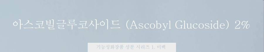 아스코빌글루코사이드(Ascobyl Glucoside)는 아스코빅애씨드(비타민 C)와 포도당(글루코스)의 효소 반응을 통해 만들어진 성분입니다. 아스코빌글루코사이드는 비타민 C 보다 외부 환경(열, 빛, 공기)으로 부터 훨씬 안정적인 성분으로 인체 내로 파괴되지 않고 온전히 비타민 C를 공급할 수 있게 해 줍니다.