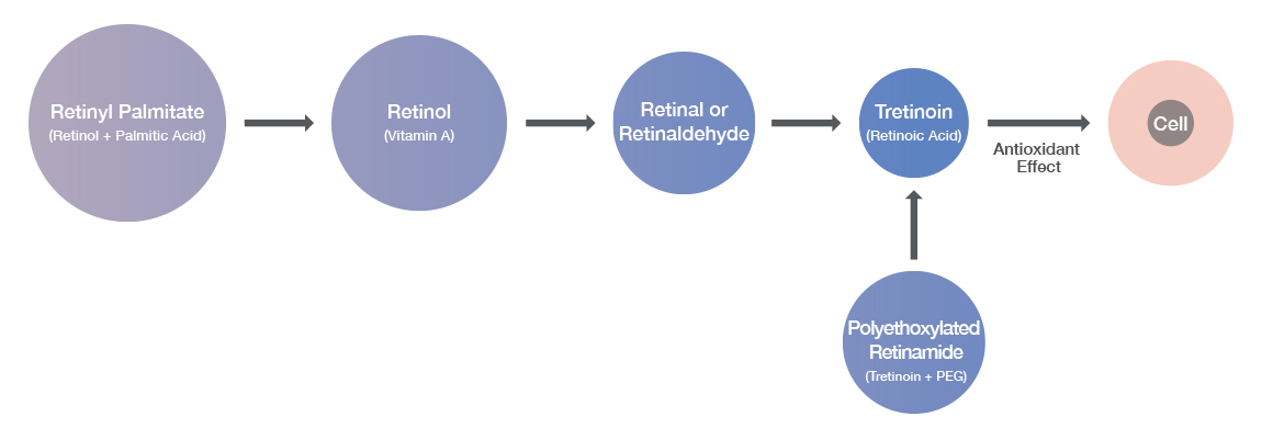 레티놀은 비타민A를 칭하는 화학명이고 트레티노인은 위에서 언급한 바와 같이 비타민A의 산 형태입니다. 물론 둘 다 비타민A 계열이므로 유사점이 있을 수 있습니다. 하지만 레티놀이 트레티노인으로 변화하기 위해서는 피부 표피를 침투하여 체내로 흡수된 후 레티날(retinal)로 변환하거나, 생화학적인 과정을 거쳐 레틴알데하이드(retinaldehyde)로 변환 된 후 활성 대사산물인 트레티노인으로 최종 변환됩니다.