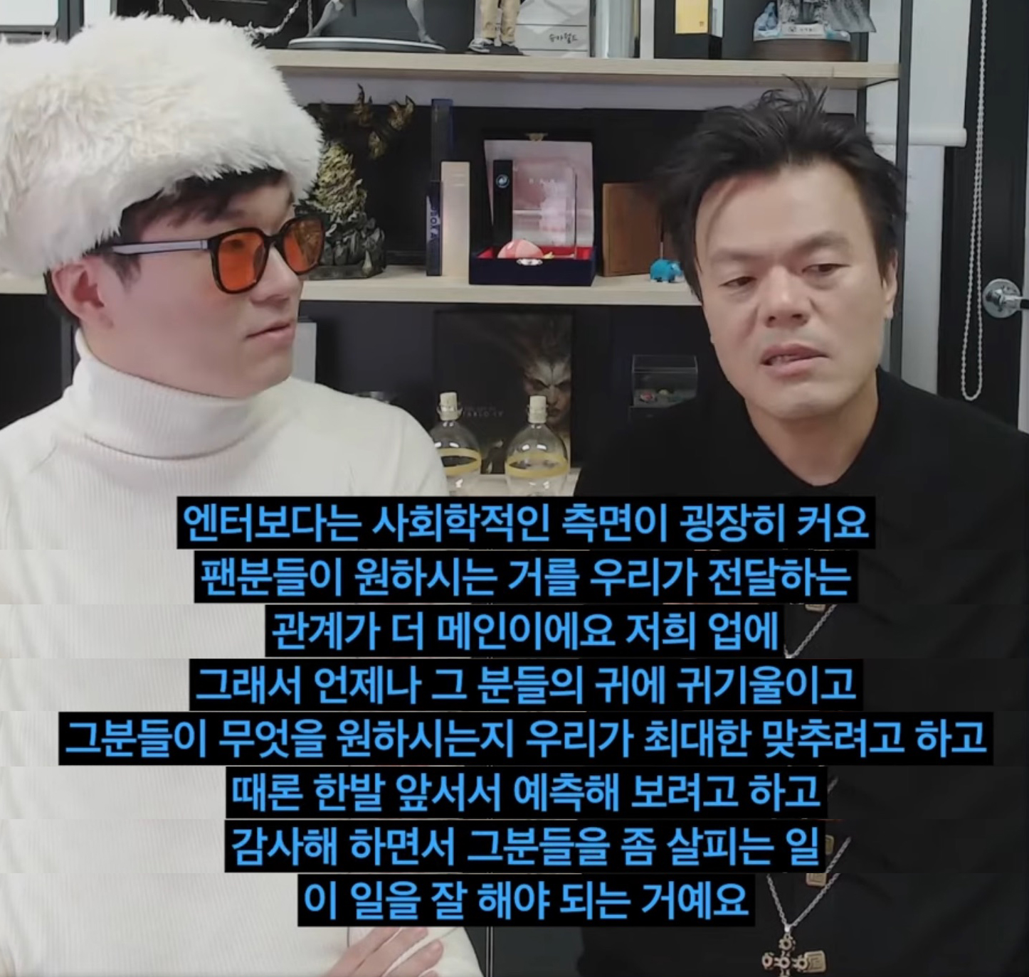 아래는 박진영 님이 슈카월드에서 K-pop 산업에 대한 이야기를 한 내용인데 비단 엔터만의 얘기가 아닌 것 같습니다. 트와이스가 트와이스 스러움을 잃지 않으면서 팬들을 살피는 것처럼 뷰티 업계도 각자의 브랜드 철학과 정체성을 간직하면서 팬들과 긴밀하게 소통하는 것이 브랜드가 건강하게 성장할 수 있는 방법이라고 생각합니다.